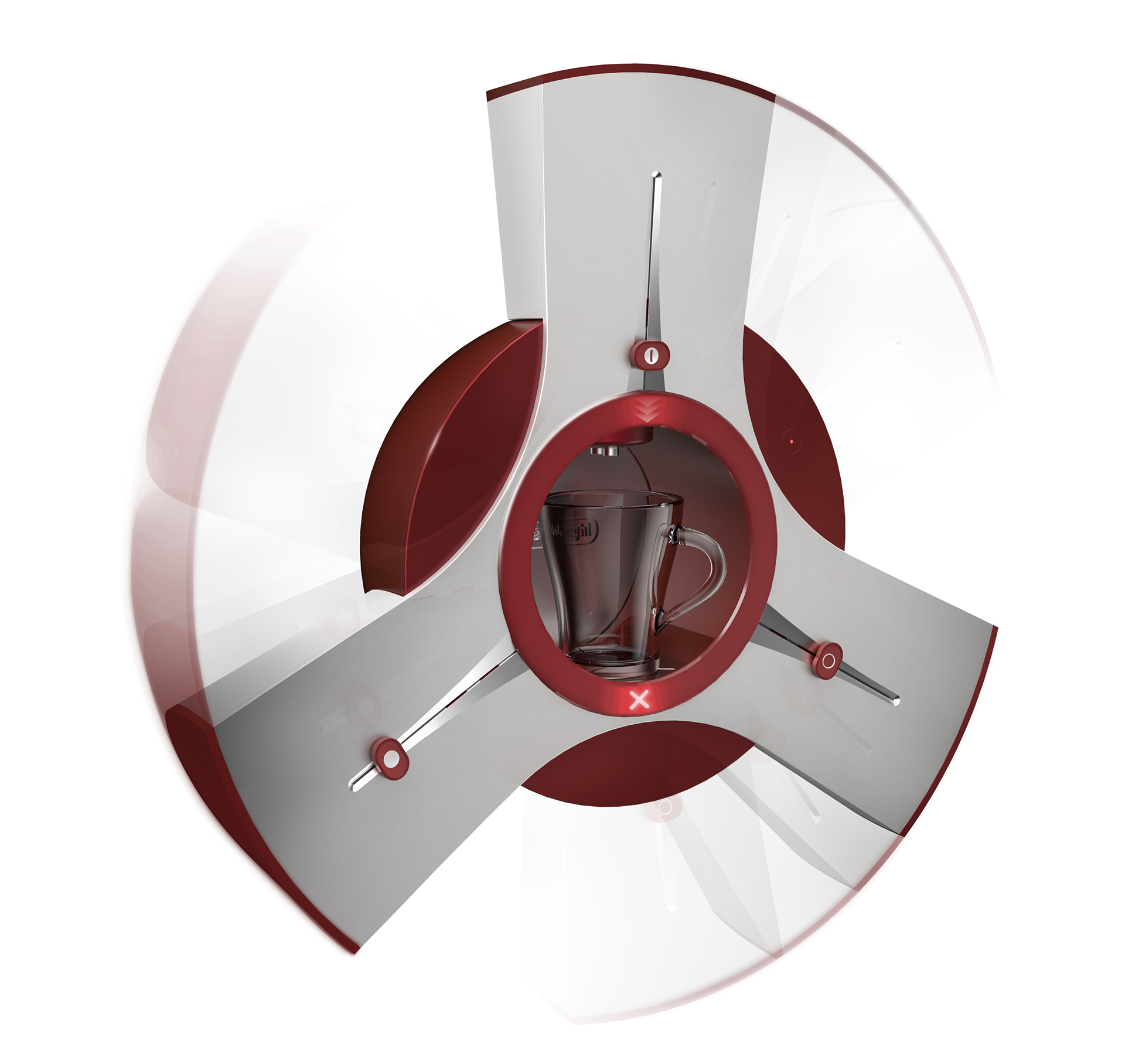 In the context of DeLonghi’s ‘Design Academy project’, Passione attends a niche that sees coffee as an enjoyment product. Passione seeks a more ritualistic, involved and at the same time easy way of preparing coffee: giving the user total control on combining coffee, water and milk. After setting it through its analogical interface, the machine ‘drops’ automatically the ingredients one by one in the cup. The rotation is a visual hint about the process. It also has pre-programmed the classic coffee drinks (Cappuccino, Latte, Espresso, etc) accessible through pressing one button. This project was in exposition at the IFA Berlin in 2010 and was chosen to represent the whole program appearing in the cover of all the marketing material.